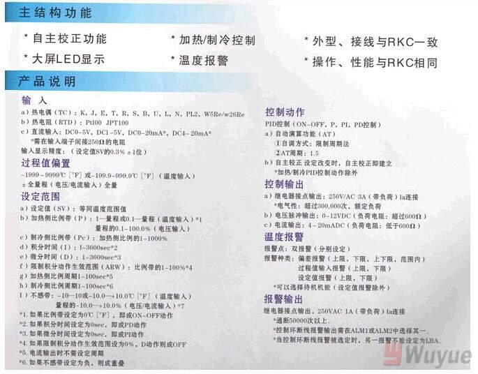 *自主校正功能*大屏LED顯示 *加熱/制冷控制*溫度報(bào)警*外型操作接線(xiàn)與RKC 一致*性能與RKC 相同